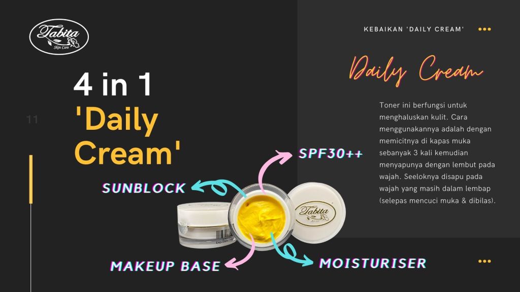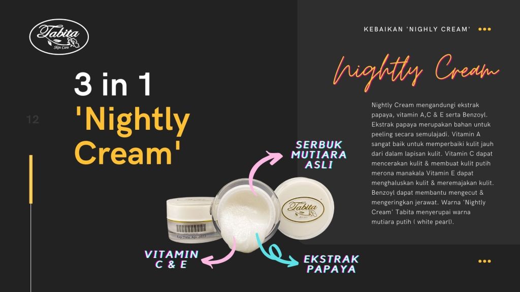 Formula Tabita Skincare mengandungi ekstrak betik, Vitamin A, C dan E. Vitamin A dapat membantu untuk mengeringkan jerawat dan membuat jerawat takut untuk muncul kembali. Vitamin C sangat berguna untuk mencerahkan warna kulit secara semulajadi, sehingga kecantikan anda terlihat semulajadi, tidak seperti menggunakan ubat-ubatan kulit lainnya dan tentunya tidak membuat kulit kita begitu bergantung kepada produk.