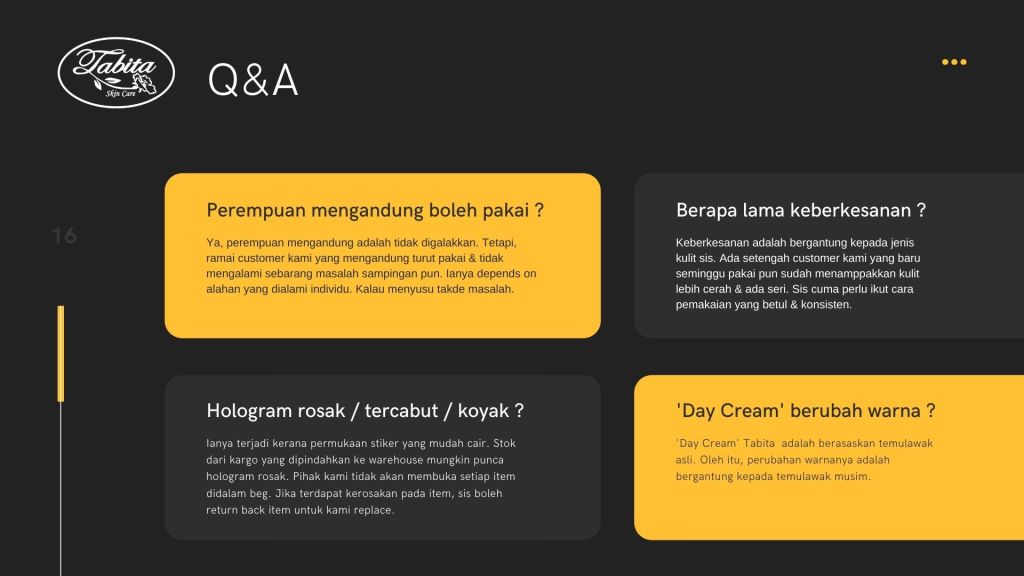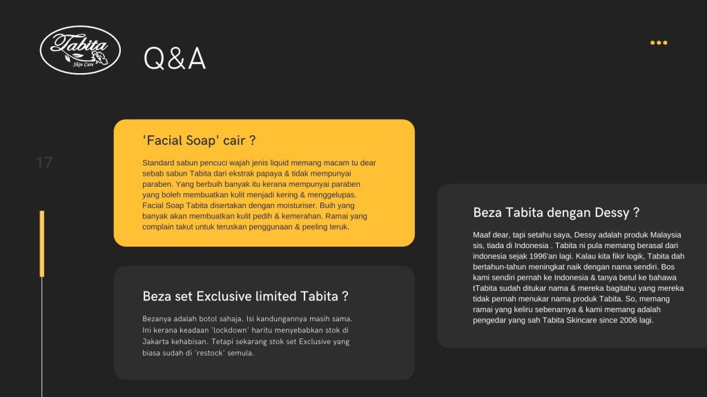 “Salam, saya Fatin yang selalu order set Tabita dengan sis. Dah 3 tahun saya selalu repeat order dengan sis. Dah percaya sangat dengan tabita yang sis jual. Memang original tak sama dengan yang lain.Alhamdulillah, muka saya pun dan makin licin bersih dan jeragat pun dah takde.”