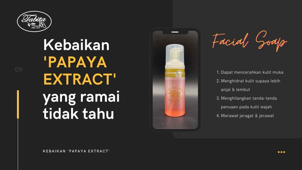 Tabita Skincare menggunakan ekstrak betik sebagai bahan utamanya, ekstrak betik juga sudah sangat dikenali berkhasiat untuk mencerahkan kulit dan mengatasi pigmentasi serta menstabilkan kondisi kulit (yang berminyak menjadi normal, yang kering turut menjadi normal) sehingga membuat produk skincare ini sesuai untuk semua jenis kulit dan semua masalah kulit.
